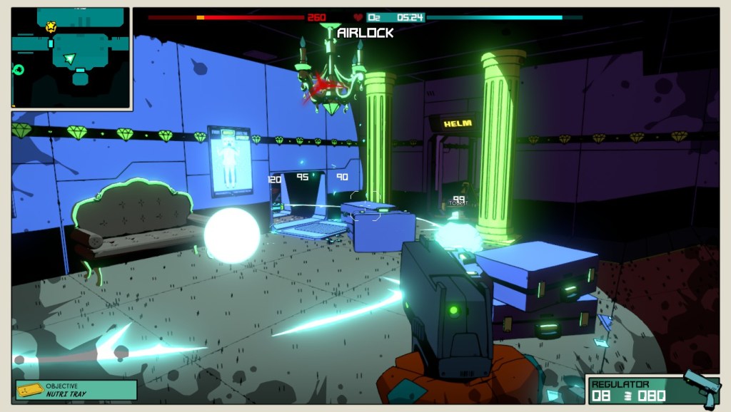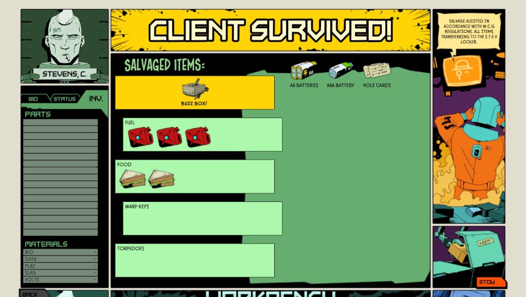 Void Bastards é um rogue-lite Sci-Fi em primeira pessoa. A acção passa-se no espaço a bordo do S.T.E.V.E., uma nave pessoal de transporte e o jogador calça as botas de um prisioneiro. A aventura começa no Void Ark, uma nave espacial que transporta uma série de criminosos transformados numa espécie de sumo de laranja em pó (um “Tang” de certa maneira) que, de acordo com as necessidades do poder vigente, são aguados, misturam-se e *poof*, voltam à forma humana. A nave está avariada e o objectivo do jogador é coleccionar uma série de peças para repará-la e conseguir escapar da Sargasso Nebula, um espaço abandonado ao caos com piratas, cidadãos degenerados, criaturas espaciais colossais e polvos gigantes. A história prolonga-se e apesar do tom sarcástico, da crítica a uma sociedade capitalista e ultra burocrática e de algumas linhas cómicas. Considerando a nota positiva no que toca a este rumo narrativo, não parece haver um verdadeiro propósito ou um final satisfatório. A narrativa constrói-se à volta da viagem, mas não há grande satisfação em voltar.