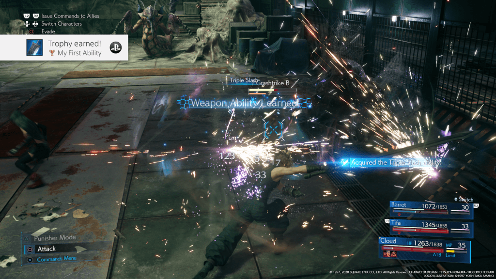 O combate em si é o meu aspecto favorito do jogo. Ao início já era divertido utilizar as habilidades e spells (em adição, cada personagem tem uma habilidade única que é usada com o triângulo), descobrir as fraquezas dos inimigos para poder atordoar os inimigos (todos os inimigos têm uma barra de “stagger” que enche dependendo da sua fraqueza, ao chegar ao máximo, os inimigos ficam atordoados e recebem muito mais dano). Mas ao longo do jogo fui descobrindo sinergias e combos que o jogo não nos diz logo ao início. No caso do Cloud, a habilidade única dele é trocar entre modos de ataque, Operator e Punisher, o Punisher é mais poderoso e tem um contra ataque, mas também torna o Cloud mais lento no fim dum combo e não pode bloquear ataques. No entanto, podem alternar entre estes dois modos entre ataques com o timing certo, reduzindo o tempo em que o Cloud fica exposto, prolongando o combo e maximizando o dano oferecido. No caso do Barret, a habilidade única dele precisa de ser recarregada com o triângulo, uma acção que o deixa exposto durante uns segundos, mas podem aproveitar a “explosão” no fim do seu combo para recarregar a habilidade mais rapidamente. Com a Tifa, por exemplo, há vários combos entre habilidades que podem executar, por exemplo, seguir um uppercut com um divekick. Juntem isto à materia, e têm uma grande variedade de opções em combate. Por fim, também têm acesso a Limits e Summons em combate. Os Limits são ataques extremamente poderosos que carregam lentamente (podem carregá-los mais rapidamente se atordoarem os inimigos frequentemente), e os Summons invocam familiares para vos ajudar em campo. Ambos têm animações impressionantes e são uma boa ajuda, infelizmente, gostava que pudessem desbloquear mais durante a playthrough normal. Há apenas 5 Summons e 2 Limits por personagem até acabarem jogo uma vez. O único problema que tive com o combate foi o ocasional mau ângulo da câmara.