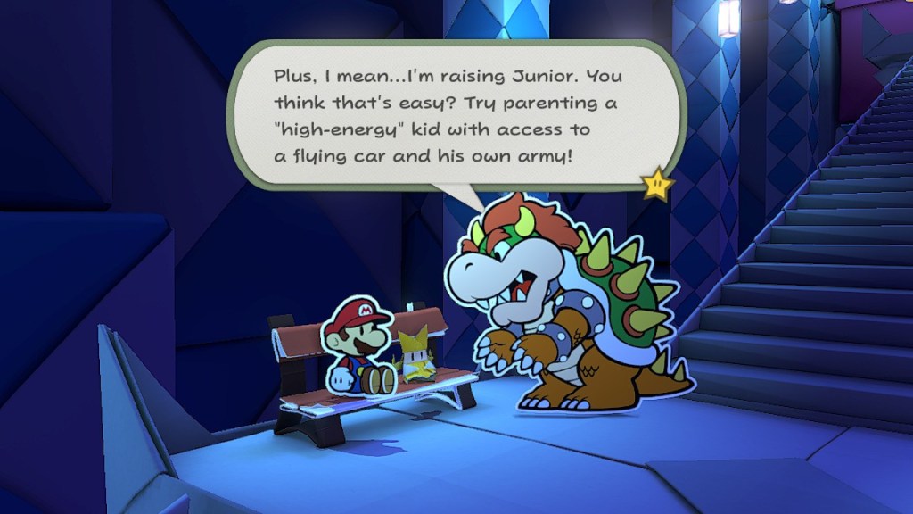 Desde o início ao fim, o enredo mantém-se simples e acaba por não ser nada surpreendente ou inovador, mas não é a força vital do jogo. Porém, a vivacidade das personagens como a Olivia, Bobby (um Bob-omb com uma história trágica), o Capitão T. Ode e as criaturas que vamos descobrindo e com quem interagimos, elevam a narrativa, transformando algo que poderia ser simples, num mundo repleto de humor. Toda a história serve apenas como o engenho que possibilita a manifestação deste mundo fantástico. Aliás, o que me motivou principalmente a concluir este jogo não foi a perspectiva de chegar à próxima fita e resgatar a Peach (se bem que as boss battles são absolutamente incríveis, mas já chegaremos lá), mas sim explorar mais do mundo de Origami King. Cada região que descobrimos está repleta de pequenos segredos e momentos hilariantes. Desde a festa do Shy Guy mexicano que só quer comer uma lata de atum, até ao running gag do café com um estilo noir que aparece transborda uma vivacidade inescapável que enche o jogador com uma vontade de querer continuar e descobrir mais.