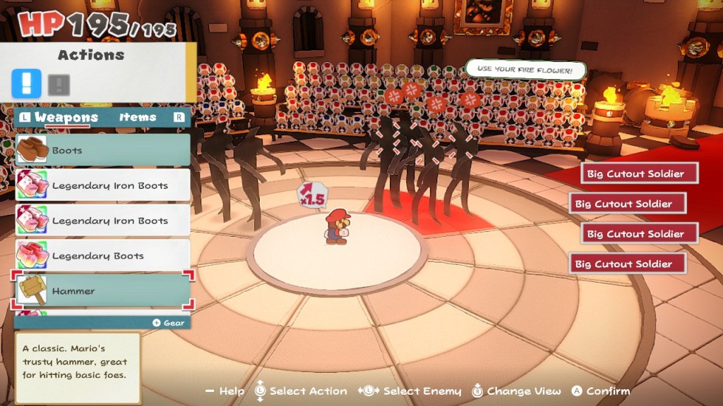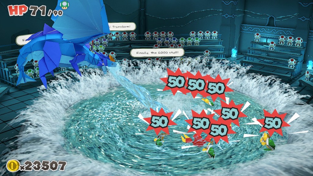 A base do combate nunca muda, o que o torna rapidamente repetitivo. Existem algumas variações que dão algum gosto, mas não são suficientes para tornar o combate apelativo, sentido-se por vezes como uma tarefa e não algo que o jogador deva ansiar. Os puzzles são na sua maioria de fácil solução, existindo algumas exceções , sobretudo quando a variedade de inimigos permite que alguns cenários se tornem divertidos: os Boos que só se revelam ao início e desaparecem imediatamente obrigando o jogador a lembrar-se da posição deles; os soldados cutout (pequenas figuras cortadas de papel), que à medida que mexemos na horizontal, se multiplicam; os inimigos com bolas de neve por cima da cabeça que anulam os ataques e obrigam o jogador a pensar em estratégias alternativas. Infelizmente estes são exemplos esporádicos e mesmo este tipo de inimigos aparecem mais tarde e raramente. Via-me constantemente a evitar os oponentes no mundo para não ser forçado a entrar em combate e revirava os olhos nas secções em que, já super entusiasmado pela história, era obrigado a lutar contra inimigos genéricos e a perder mais tempo.