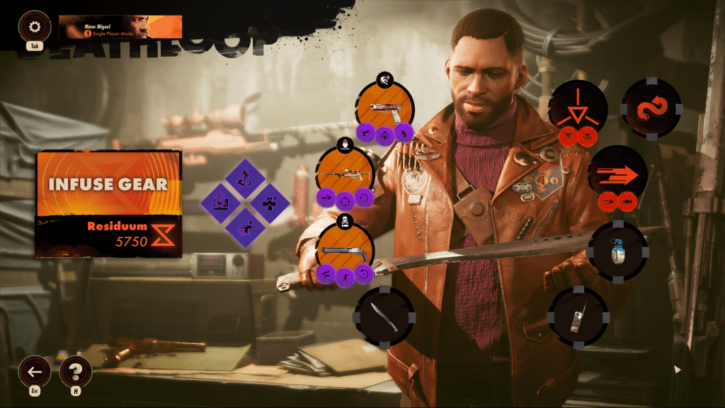 Mas o que é que acontece se morrerem? Voltam ao início do loop e perdem o vosso progresso durante esse dia (mas como o Colt não se esquece do que acontece, ele mantém as pistas que encontrar). Para o que parecia inicialmente ser um Roguelite, a morte neste jogo raramente tem grande impacto, sendo as únicas vezes que irão perder progresso significativo quando têm de realizar uma ação ou investigação que requer várias fases do dia no mesmo loop. “Perco o meu loot?” Sim e não: pouco depois da introdução do jogo desbloqueiam uma forma de guardarem as vossas armas permanentemente usando “Residuum”, uma espécie de moeda que ganham ao absorver certos objetos, derrotando Visionaries ou sacrificando loot, dependendo da raridade do loot este custará mais residuum.