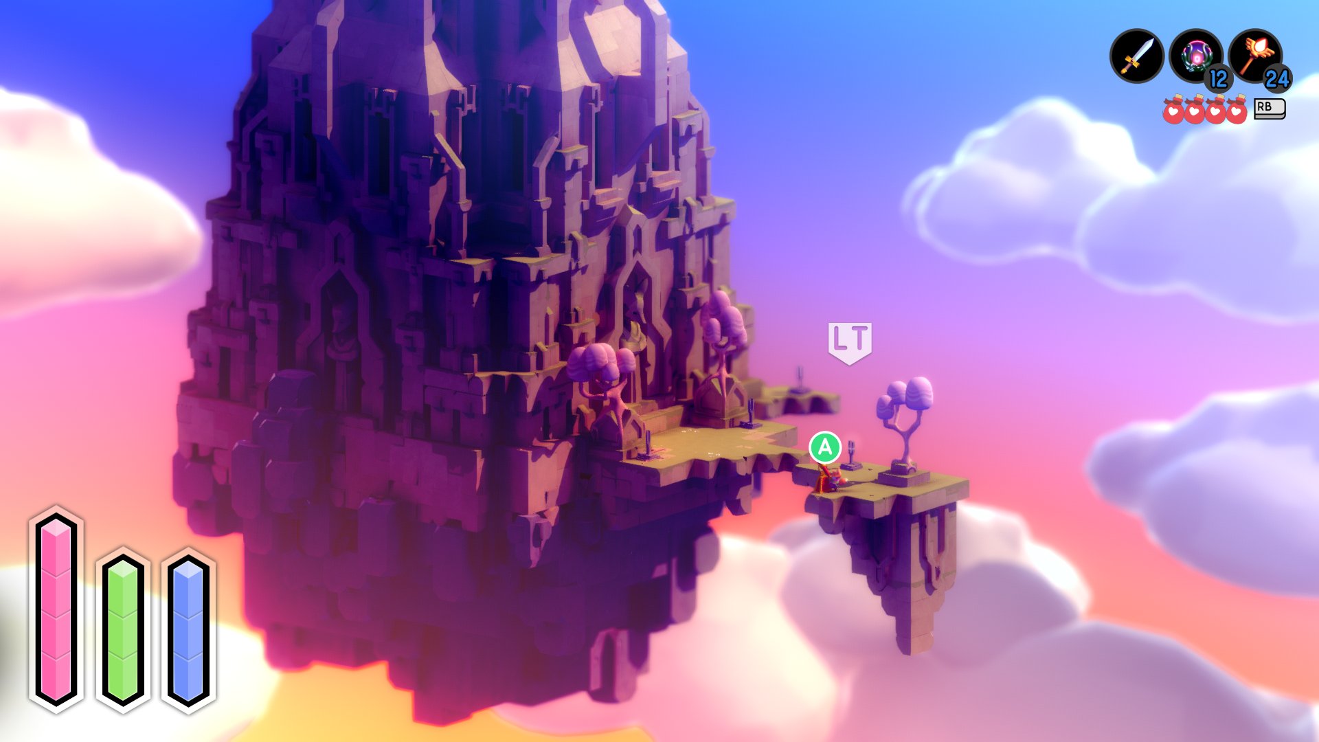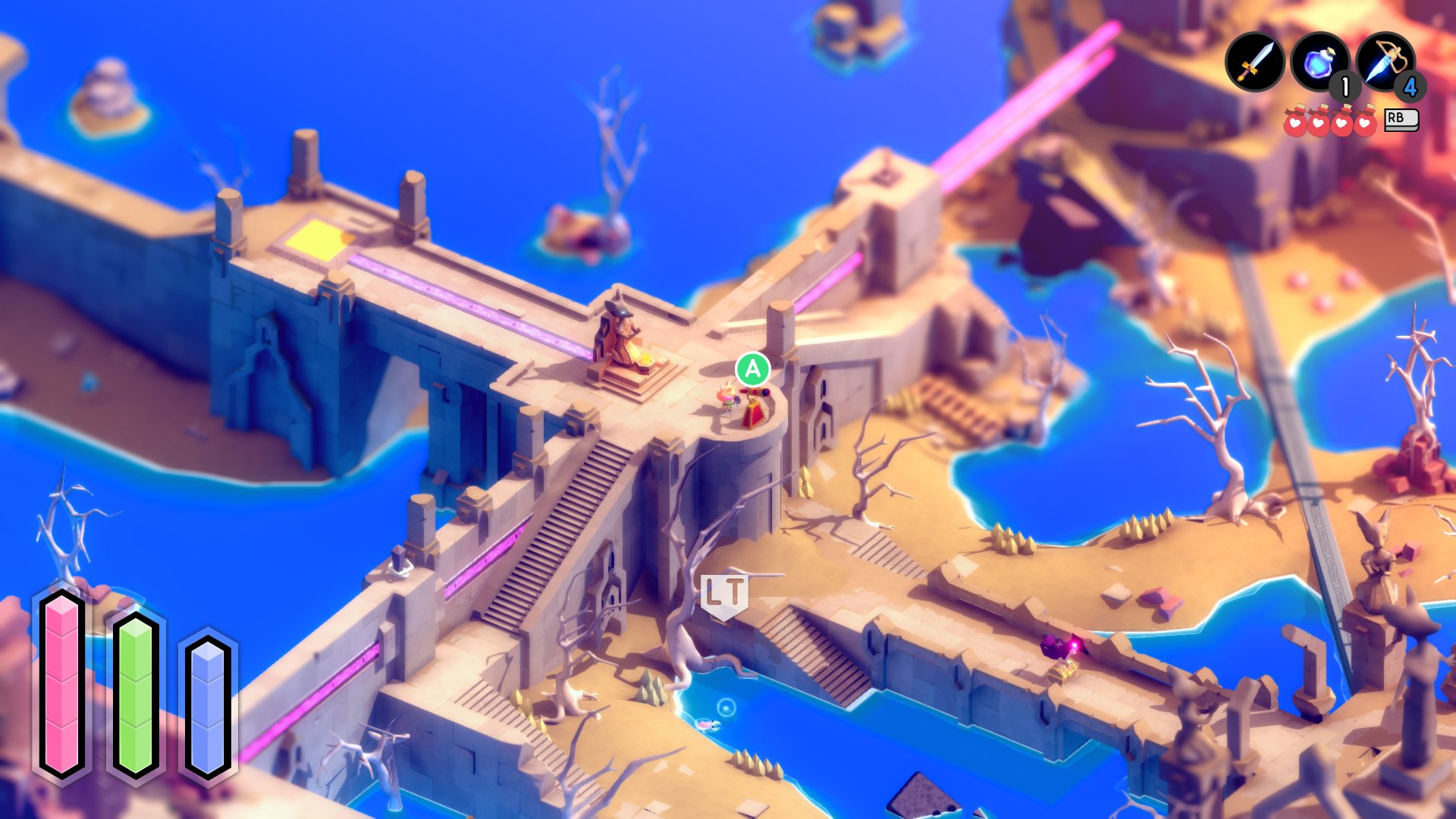 Perto do final já tinha grande parte do manual completo e conseguia montar as peças da narrativa deste mundo. Lutei contra o boss final e tive um final… mau? Pois, há qualquer coisa no manual que faz alusão a um final diferente, algo sobre “partilhar o nosso conhecimento”. Confesso que fiz batota e pesquisei sobre os finais do jogo, e um deles requer completar o manual. Resolvi ler o manual com atenção, tentar descobrir o que era o “Golden Path” e a “Holy Cross” e se eram importantes (são). Aos poucos fui percebendo os segredos e esta busca pelas restantes páginas do manual foi das minhas partes favoritas no jogo todo. Ao perceber o que era esta Holy Cross, abriram-se, muito literalmente, várias portas no mundo de Tunic, repletas de quebra-cabeças aliciantes que até me obrigaram a fazer algo que não fazia num jogo há muito tempo: apontar pistas num bloco de notas.