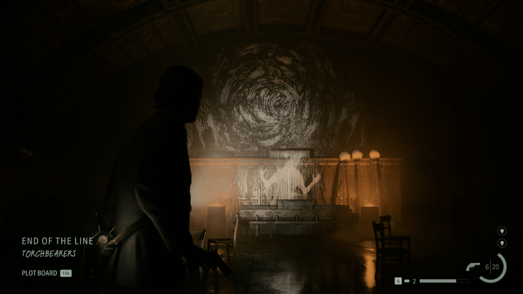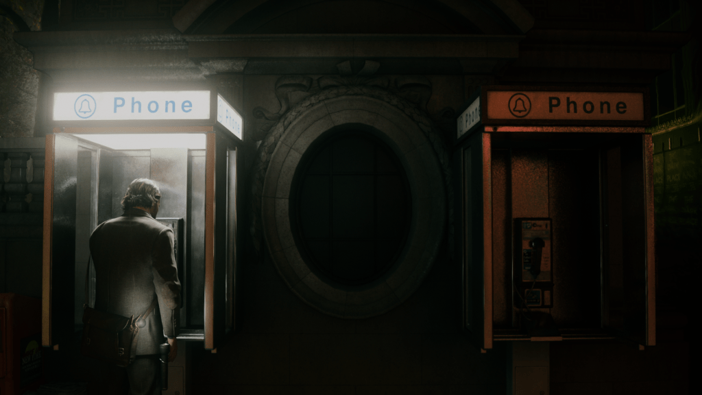 Gostava que este case board fosse mais interativo, com alguma forma de incentivar o jogador a fazer o seu próprio trabalho de detetive em vez de simplesmente arrastar as pistas para o quadro até que uma encaixe. A versão do Alan disto é mais interessante (ainda que não seja perfeita), onde em vez do case board, têm um “story board”, e ao explorar descobrem “plot threads” – narradas pelo James McCaffrey, voz do Max Payne, que é simplesmente arrasador aqui – que podem usar para mudar a história, e consigo, o mundo de forma a desbloquear novos caminhos.
