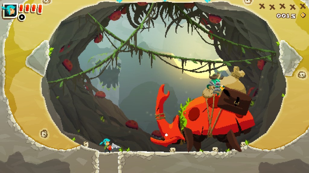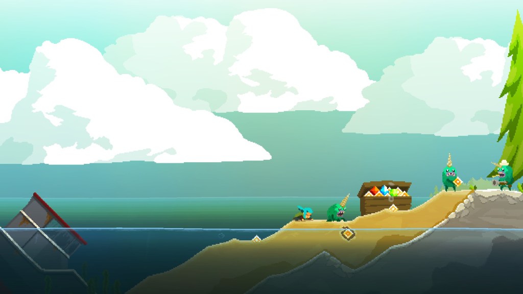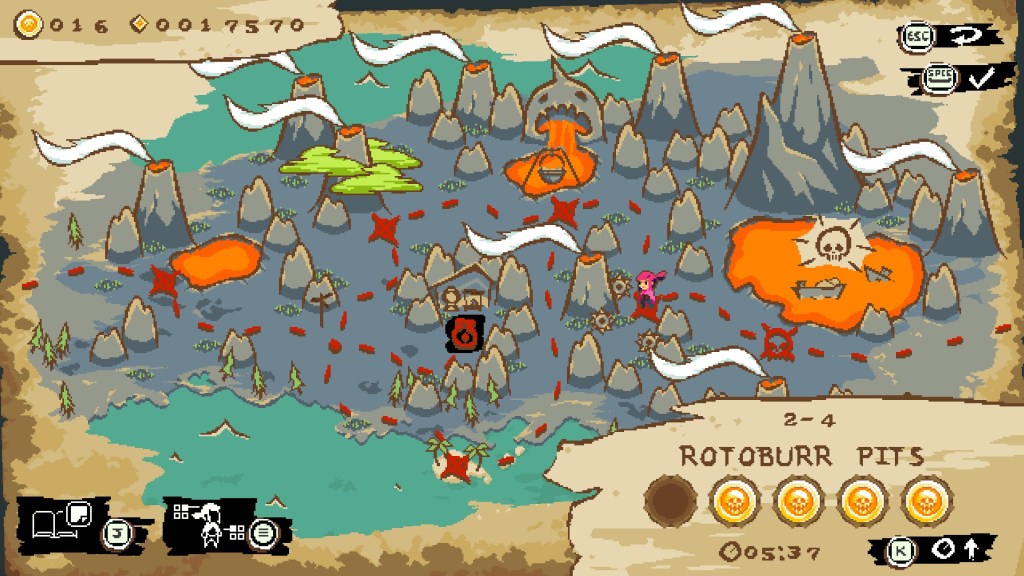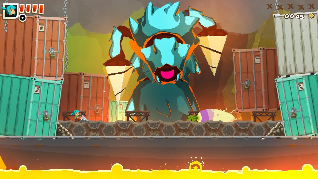 No que toca à direcção artística, à primeira vista, é mais um jogo com pixel art colorida e aquele charme que centenas de outros indies já replicaram. Isto não é uma crítica: embora não se vá destacar neste aspecto, há aqui alguns bons pedaços visuais que até me surpreenderam, como os fundos que, apesar do estilo 2D, jogam com a perspectiva da câmara para dar a ilusão de ter aquela terceira dimensão e adiciona alguma profundidade aos níveis; as animações também ajudam muito o movimento fluído e o impacto do Grinder fazem com que certas partes do jogo sejam um espetáculo de explosões e caos fabulosos.