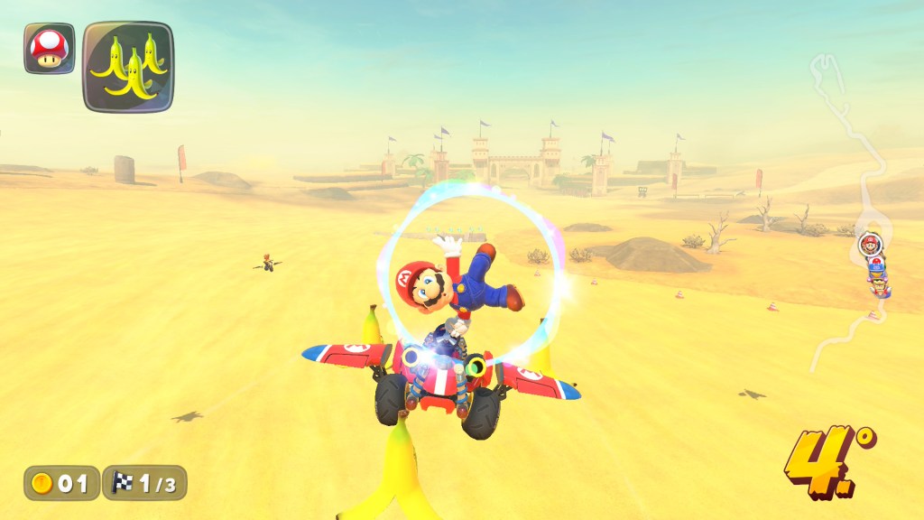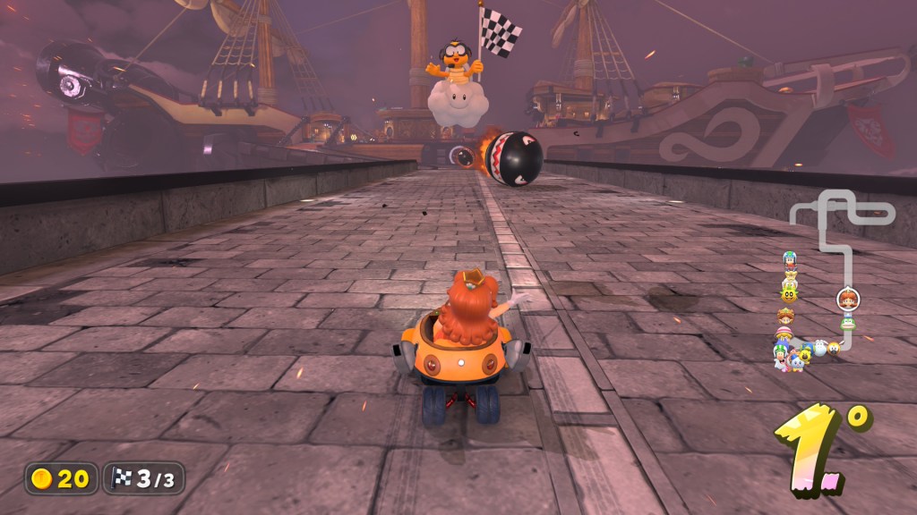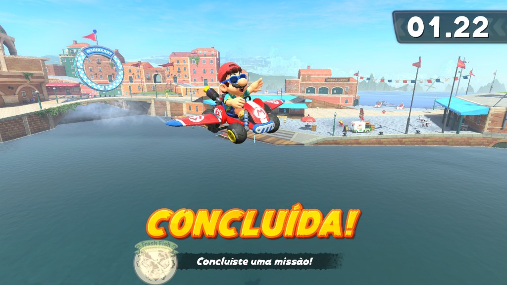 Falando agora no modo Free Roam, a outra das grandes novidades desta entrada na série, estou algo dividido, por um lado o mapa é bastante vazio e as recompensas são meros autocolantes e fatos opcionais para cada personagem (nem todas, pobre Lakitu), roçando mesmo a inutilidade para a grande maioria dos jogadores, mas há algumas missões aqui escondidas que não só são difíceis como genuinamente interessantes e divertidas de se dominar, além disso também descobri uma corrida por uma pista que não existe em qualquer outro lugar do jogo e adorei o design da pista e a forma como tenta ensinar a utilizar melhor a mecânica do salto, sinto que este modo tem todo o potencial do mundo, mas a sua execução infelizmente ficou a meio caminho.