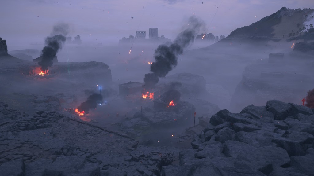 Momentos como este, onde o próprio mundo nos enfrenta diretamente são raros em Death Stranding 2 (ou pelo menos, foram raros nas minhas 70 horas pelo jogo). Por um lado, é pena não acontecerem muitas vezes, acho que em 70 horas não apanhei todos os tipos de eventos da natureza e muitos apanhei apenas uma vez, por outro, esta raridade também os torna mais especiais, e dão ao jogo algo que este precisa muito: obstáculos.